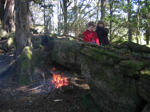 I started making a camp fire during the afternoon and eventually the boys surfaced to see what I was up to. I think they may have smelled smoke from my test burn. They decided to make their own further up the hill, using natural shelter from rocks, although the same rocks meant there was nowhere to sit down around it. That didn't worry them too much and they lit it while I built up my "proper" camp fire to use later that evening.