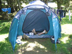 We set up the tent without trouble, but the rain started shortly after, and the boys retired indoors to play cards while a large flock of sheep was driven past our site by humans on foot, on quad bikes, on horse, in a large 4WD, and several dogs. Great fun. I joined in when it looked like the sheep were taking to the hill instead of going where they were supposed to, but they still managed to get past me and back the way they had come.